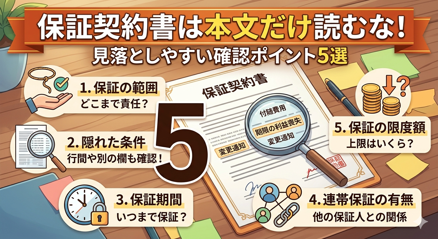 今回は、実際の保証契約書2例をもとに、個人情報を伏せた上で、契約前に見落としやすい確認ポイント5つを整理します。