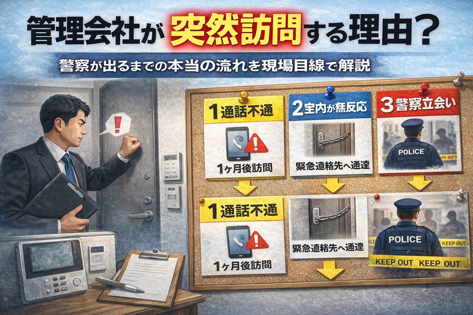 連絡不能を放置した結果、管理会社が確認行動を取る段階に入ったということです。